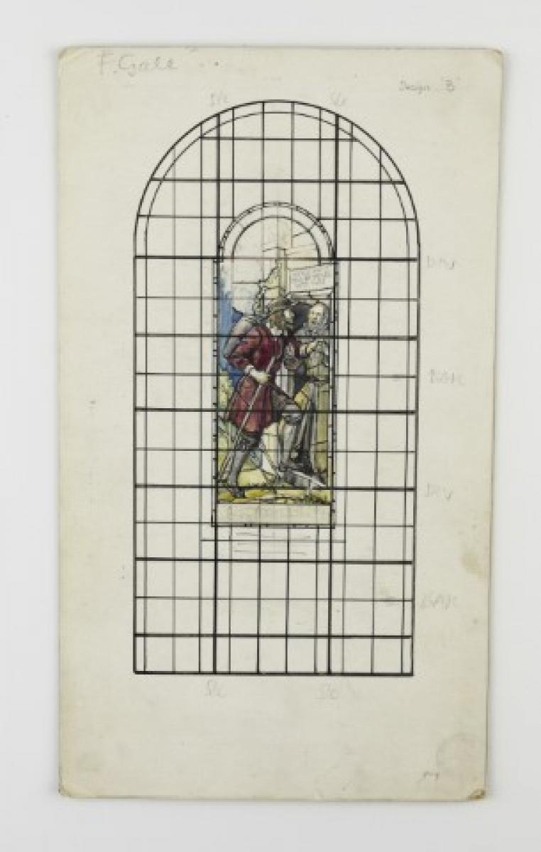 Brief description: Design for a stained glass window depicting John Bunyan. Designed at the Goddard and Gibbs studio, London