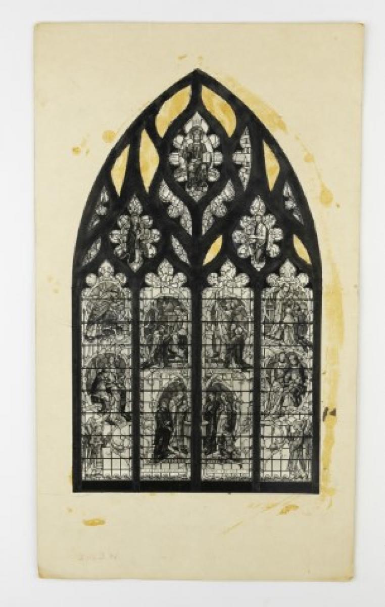 Brief description: Mounted photograph of a 4 light, 17 tracery light window depicting Christ, Mary and Joseph and 8 scenes. Designed at the Goddard and Gibbs studio, London
