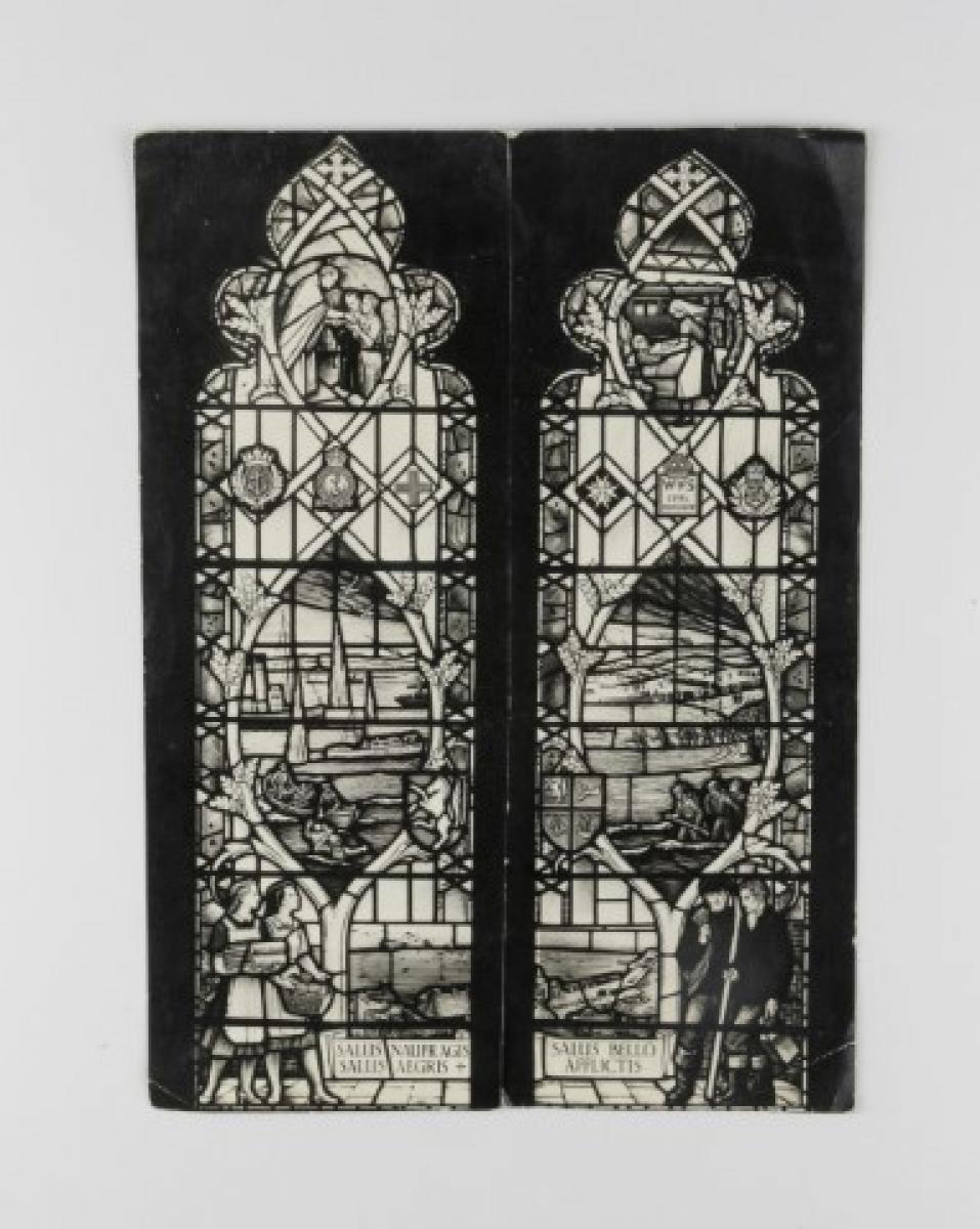 Brief description: Mounted black and white photograph of a 2 light window depicting the evacuation of Dunkirk. Designed at the Goddard and Gibbs studio, London