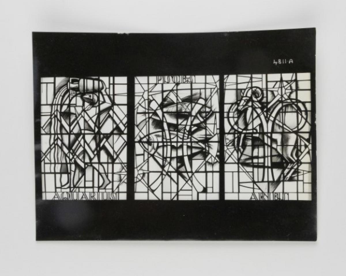 Brief description: Black and white photograph of a 3 light window depicting astrological symbols. Designed at the Goddard and Gibbs studio, London
