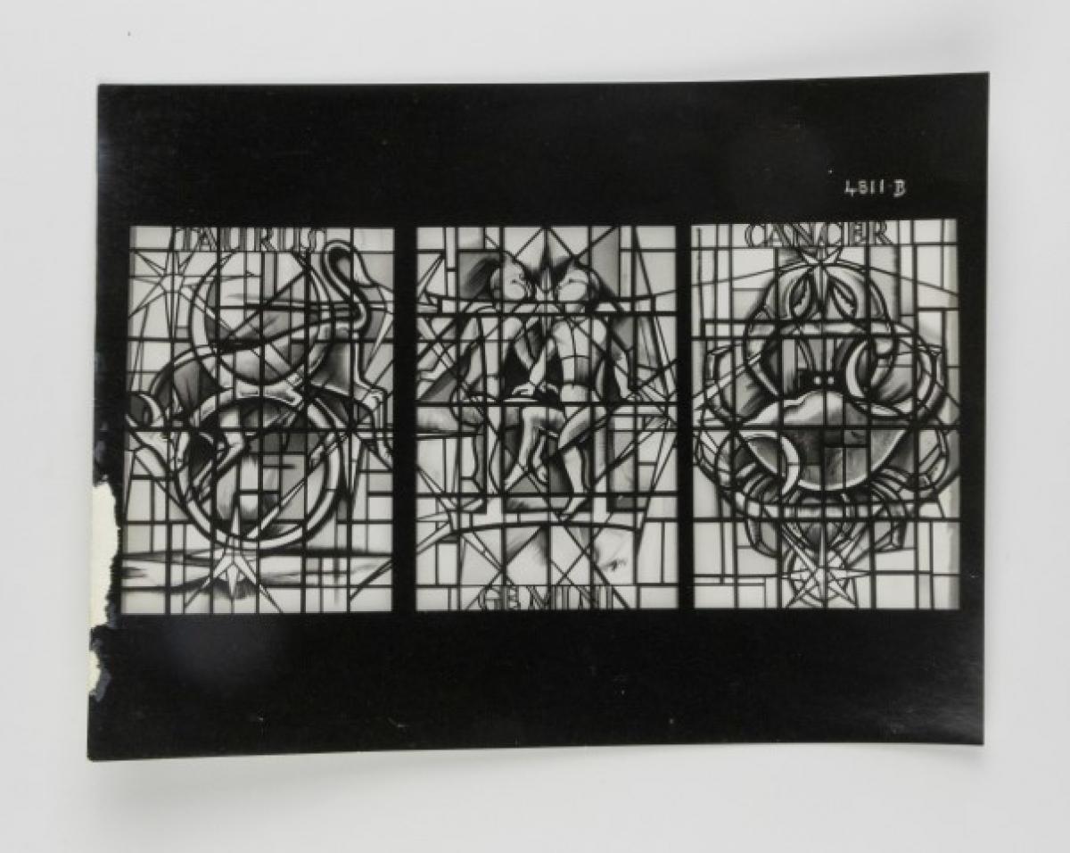 Brief description: Black and white photograph of a 3 light window depicting astrological symbols. Designed at the Goddard and Gibbs studio, London