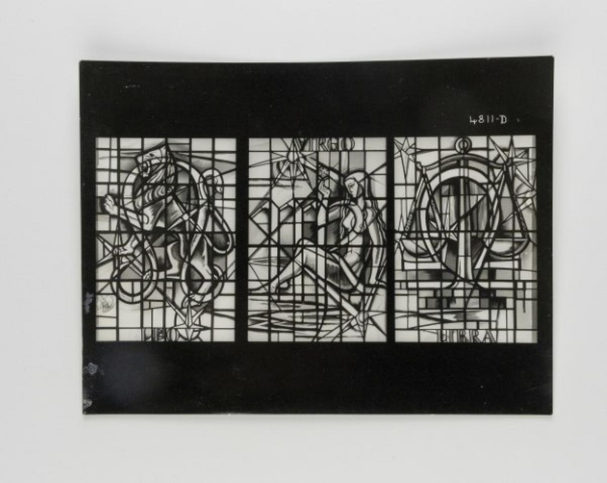 Brief description: Black and white photograph of a 3 light window depicting astrological symbols. Designed at the Goddard and Gibbs studio, London