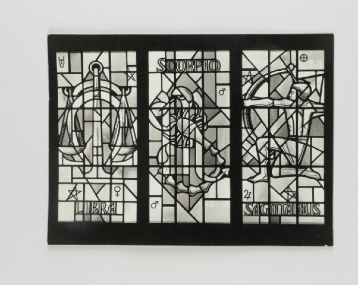 Brief description: Black and white photograph of a 3 light window depicting astrological symbols. Designed at the Goddard and Gibbs studio, London