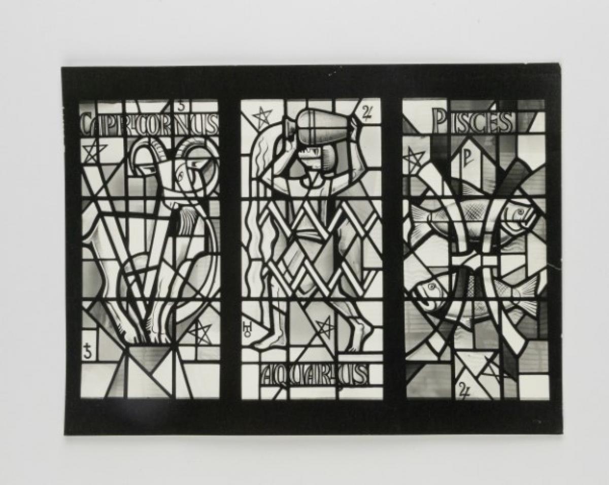 Brief description: Black and white photograph of a 3 light window depicting astrological symbols. Designed at the Goddard and Gibbs studio, London