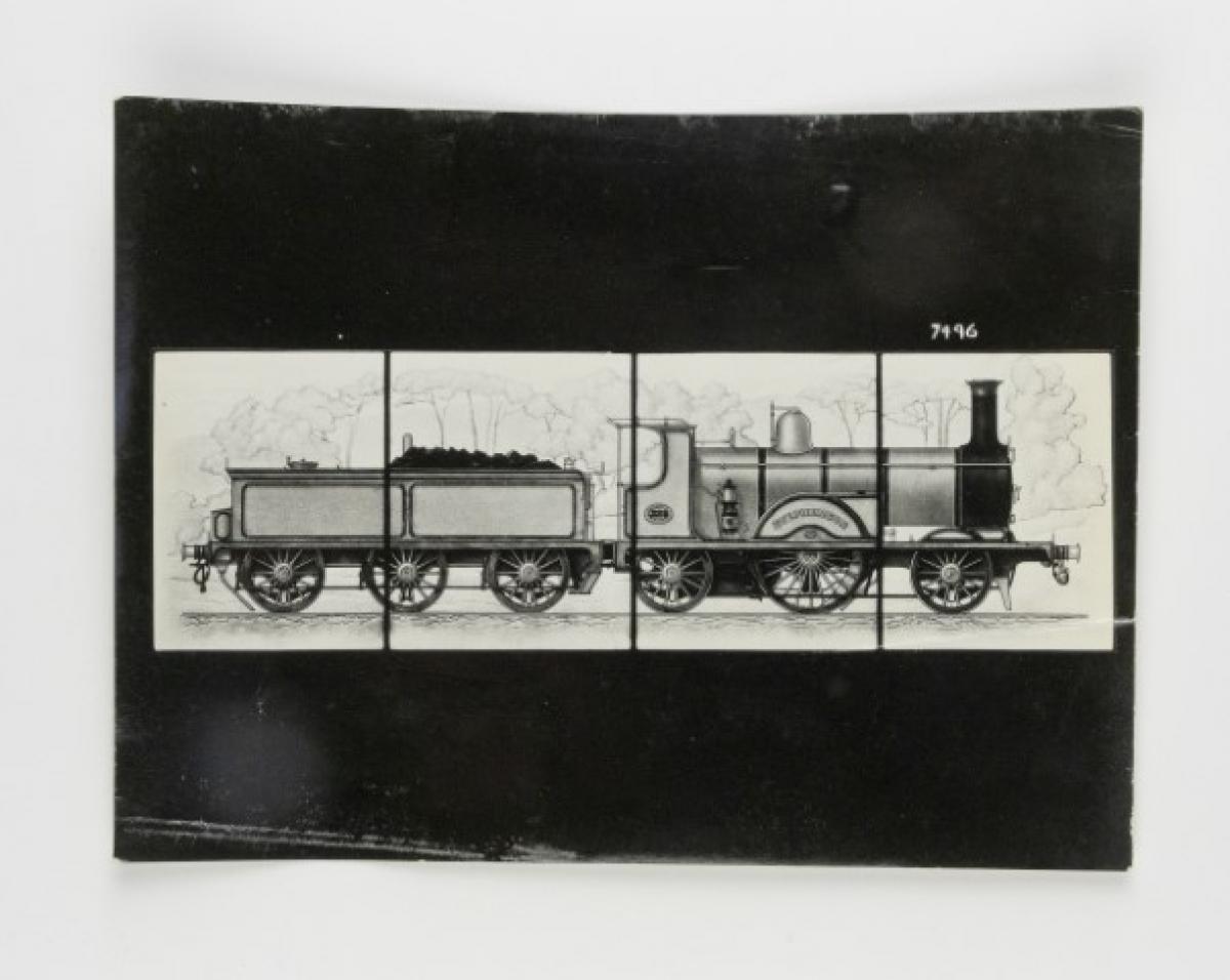 Brief description: Black and white photograph of a window depicting the Skeat Stephenson Engine. Designed at the Goddard and Gibbs studio, London
