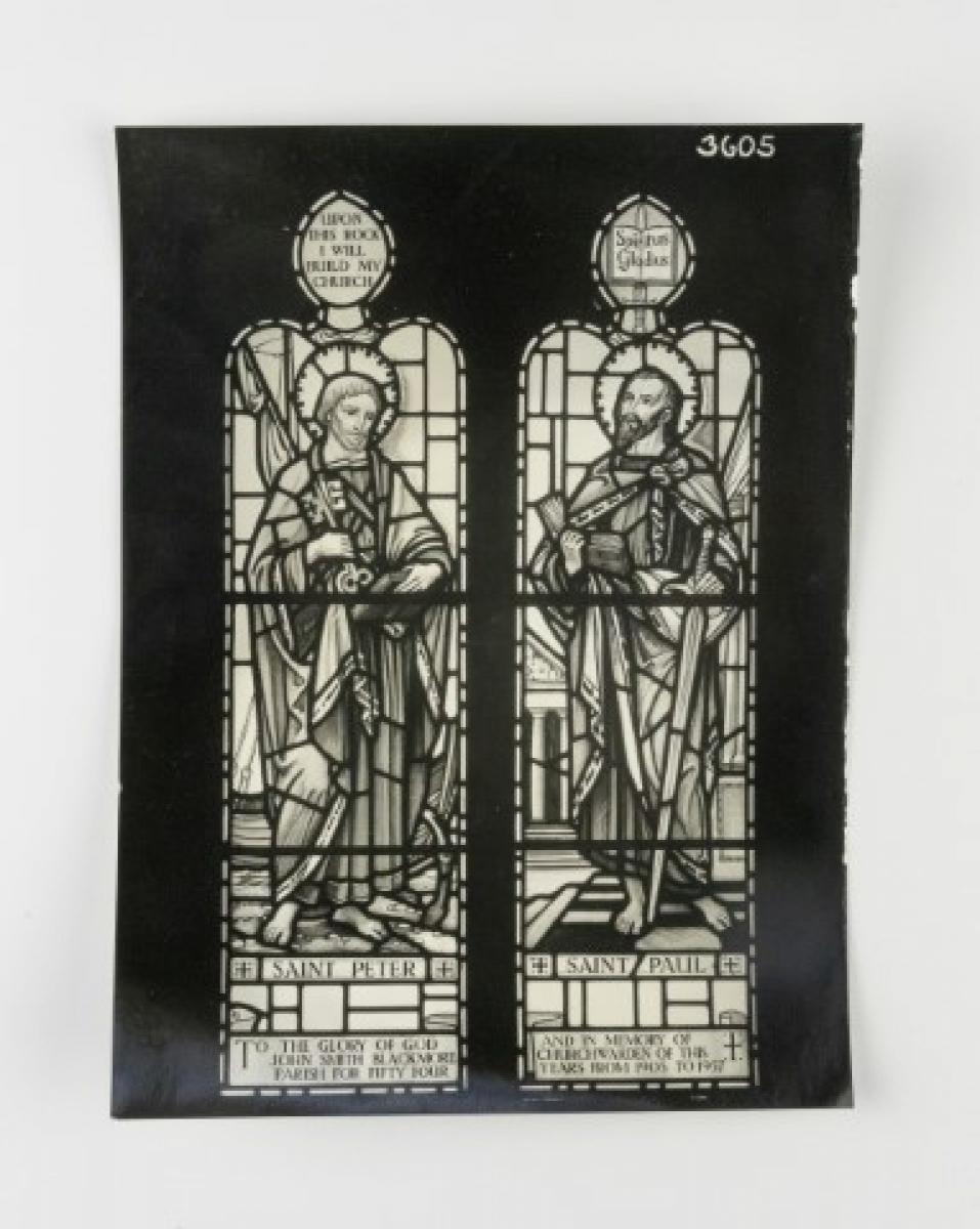 Brief description: Black and white photograph of a 2 light window depicting St Peter and St Paul. Designed at the Goddard and Gibbs studio, London