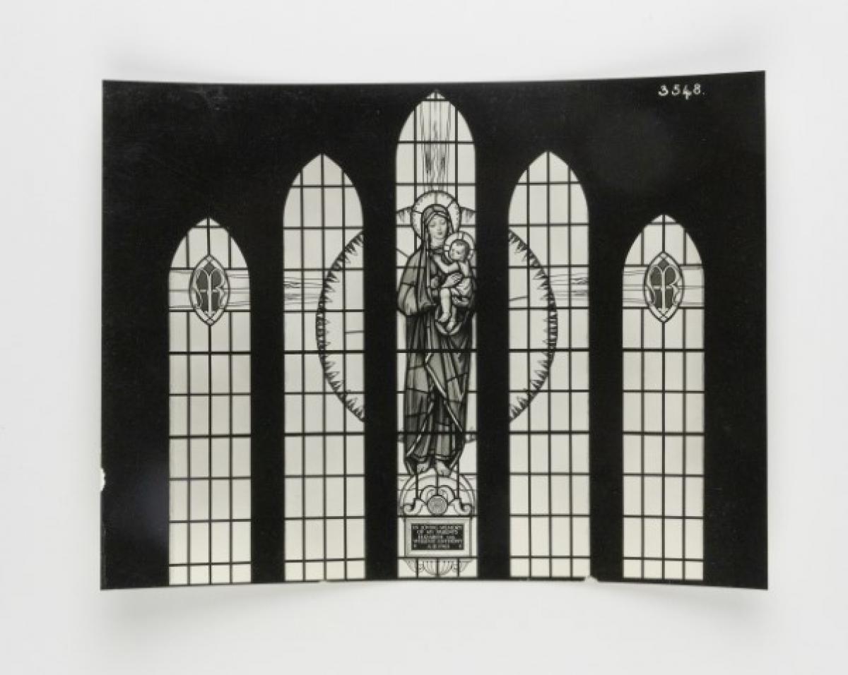 Brief description: Black and white photograph of a 5 light window depicting the Virgin and child. Designed at the Goddard and Gibbs studio, London