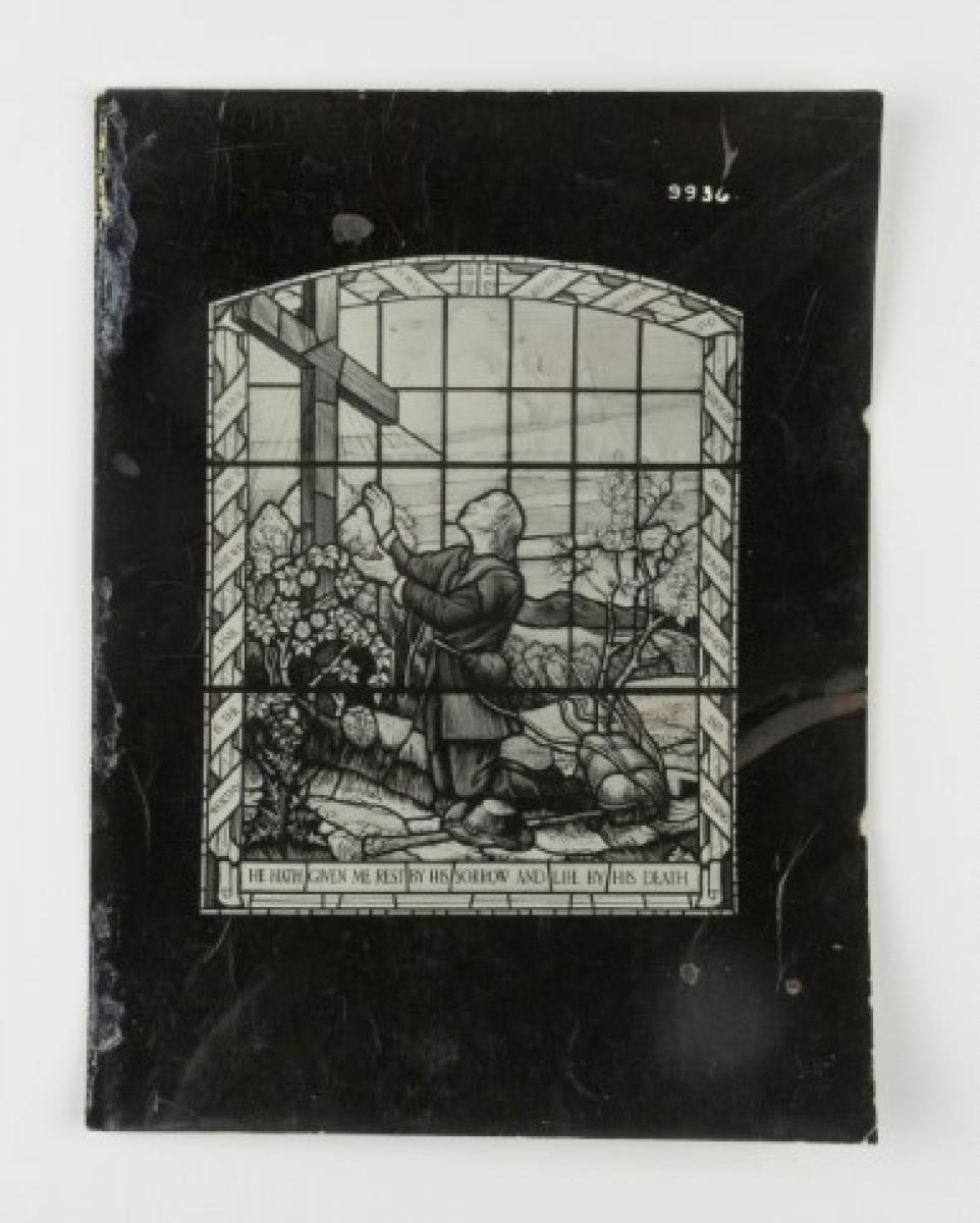 Brief description: Black and white photograph of a window depicting John Bunyan. Designed at the Goddard and Gibbs studio, London