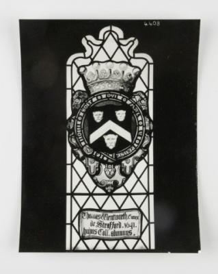 Brief description: Black and white photograph of a single light depicting the arms of Thomas Wentworth. Restored at the Goddard and Gibbs studio, London