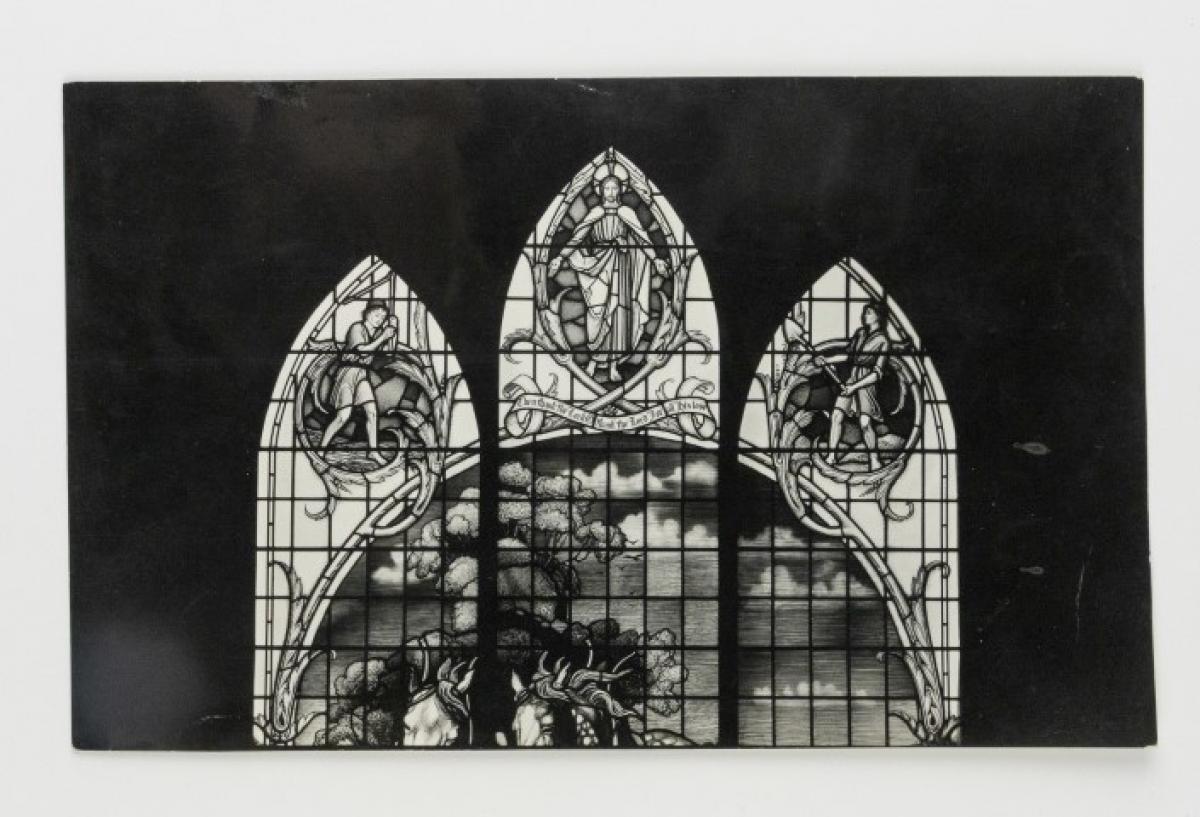 Brief description: Black and white photograph of the top section of a 3 light window. Designed at the Goddard and Gibbs studio, London