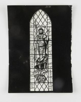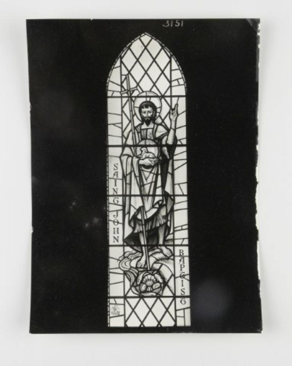 Brief description: Black and white photograph of a single light window depicting John the Baptist. Designed at the Goddard and Gibbs studio, London