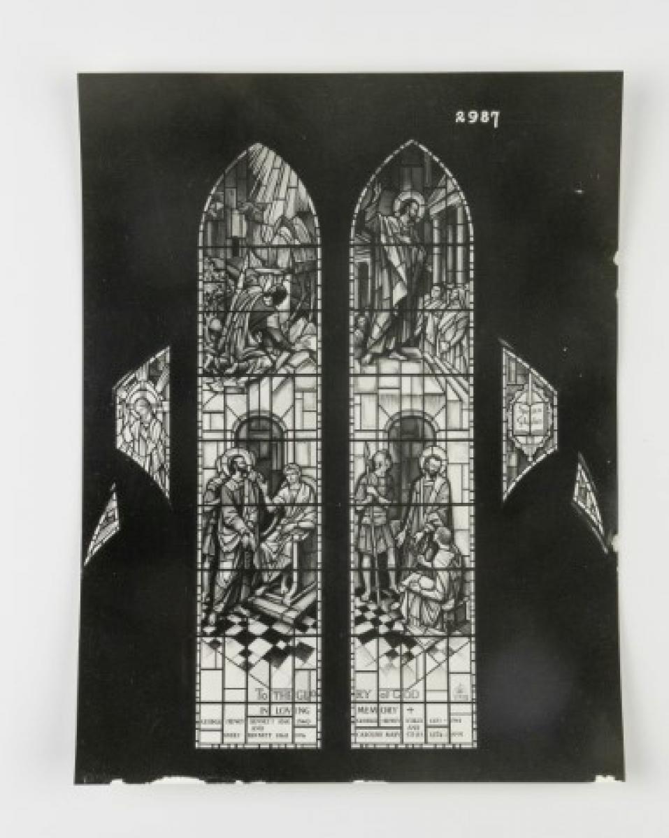 Brief description: Black and white photograph of a 2 light. 4 tracery light window depicting the arrest and trial of Christ. Designed at the Goddard and Gibbs studio, London