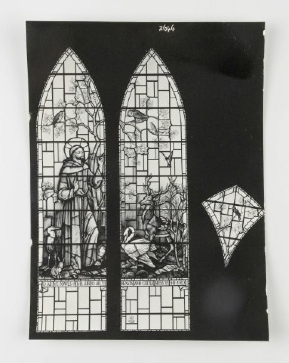 Brief description: Black and white photograph of a 2 light, 1 tracery light window depicting St Francis. Designed at the Goddard and Gibbs studio, London