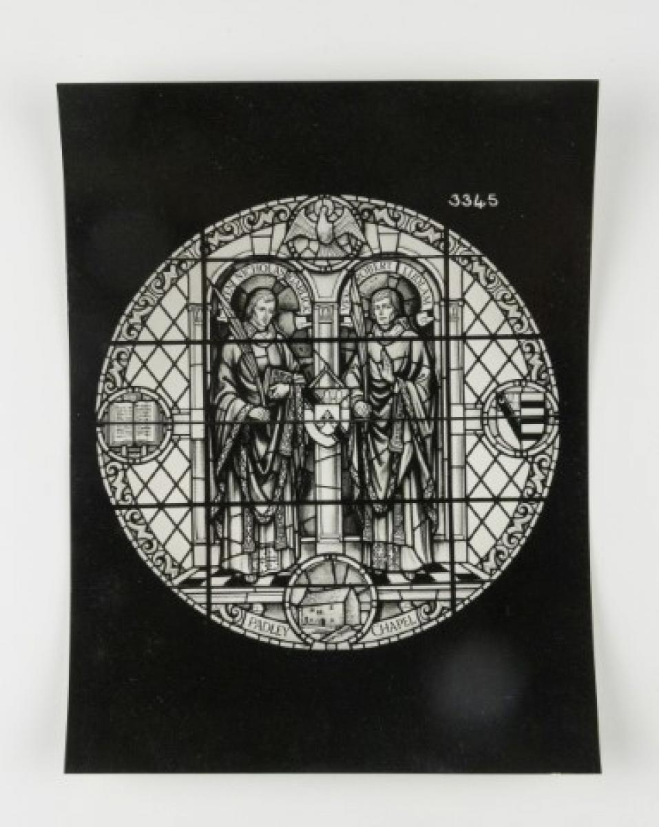 Brief description: Black and white photograph of a single roundel window depicting the Ven. Nicholas Garlick & Ven. Robert Ludlam. Designed at the Goddard and Gibbs studio, London
