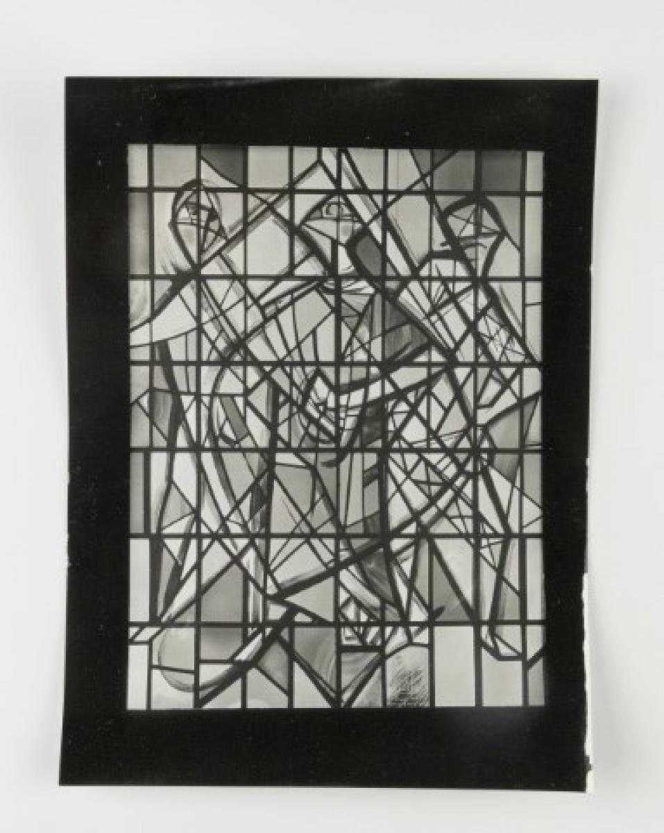 Brief description: Black and white photograph of a single light window of an abstract Mary, Joseph and Christ. Designed at the Goddard and Gibbs studio, London