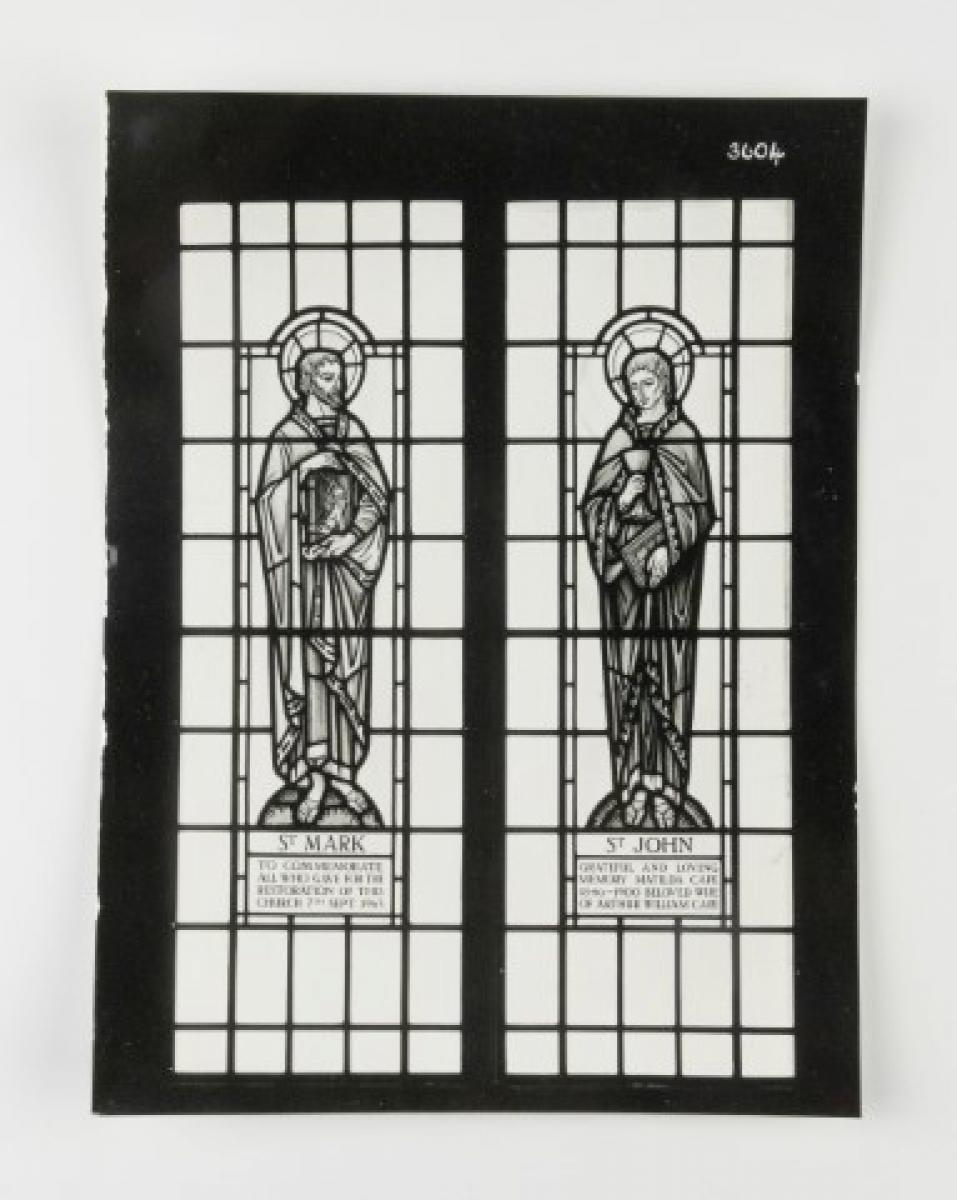 Brief description: Black and white photograph of a two light window depicting St Mark and St John. Designed at the Goddard and Gibbs studio, London