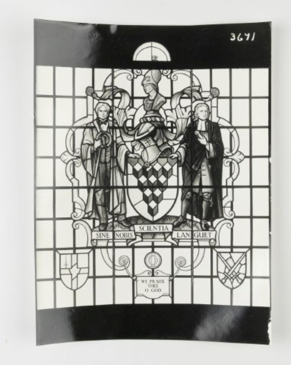 Brief description: Black and white photograph single light window of three figures. Designed at the Goddard and Gibbs Studio, London