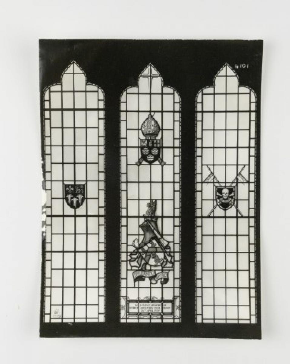 Brief description: Black and white photograph of a 3 light window with heraldic crests. Designed at the Goddard and Gibbs Studio, London