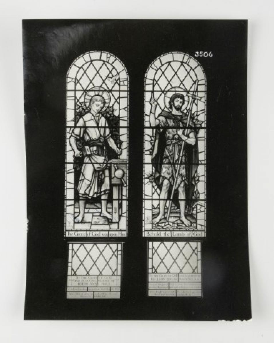 Brief description: Black and white photograph of a 2 light window depicting Christ. Designed at the Goddard and Gibbs Studio, London