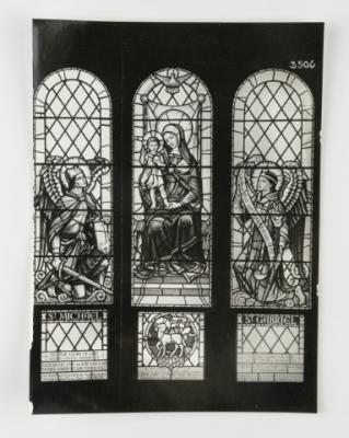 Brief description: Black and white photograph of a 3 light window depicting St Michael, Virgin and Child, and St Gabriel. Designed at the Goddard and Gibbs Studio, London