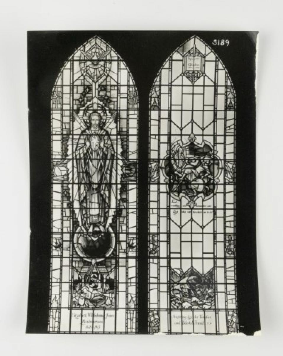 Brief description: Black and white photograph of a 2 light window depicting Christ and the sacred heart. Saul is depicted in the right hand light. Designed at the Goddard and Gibbs Studio, London