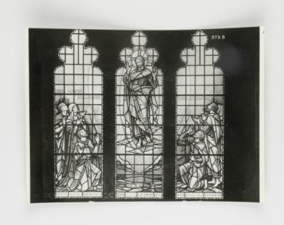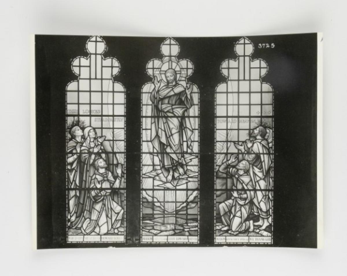 Brief description: Black and white photograph of a 3 light window depicting Christ in majesty. Designed at the Goddard and Gibbs Studio, London