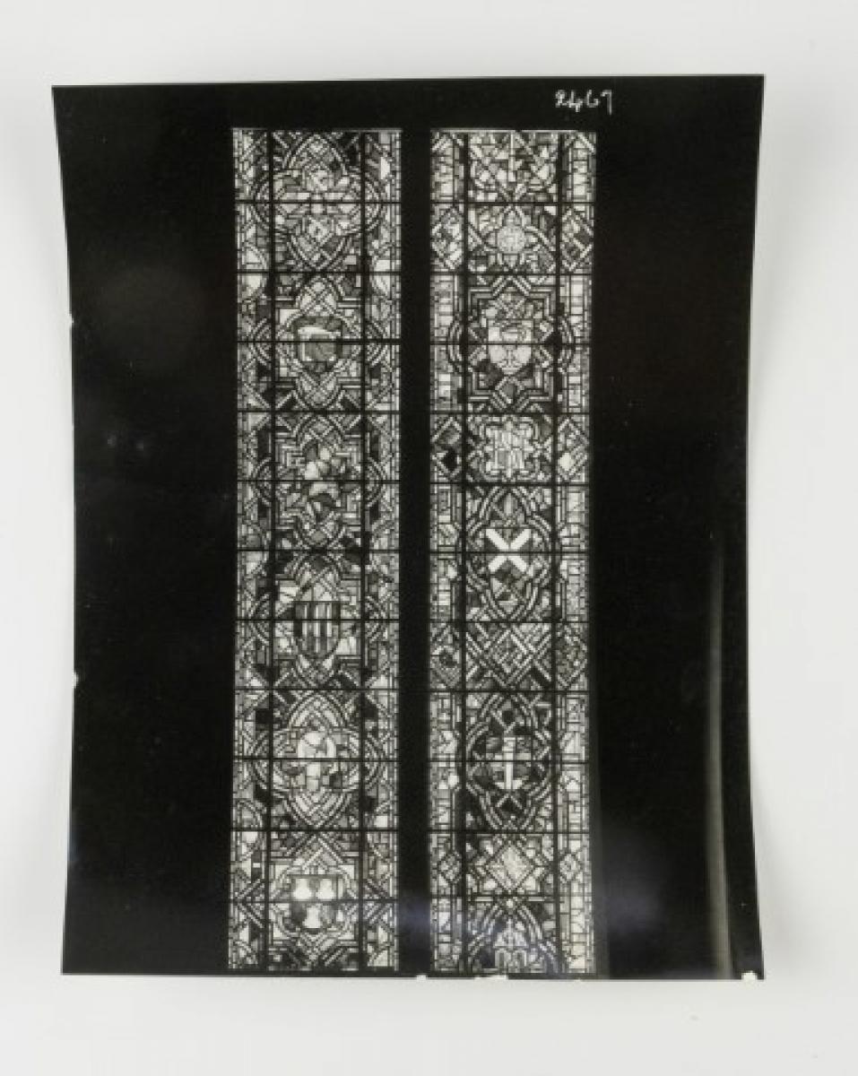 Brief description: Black and white photograph of a 2 light window depicting various icons and shields. Designed at the Goddard and Gibbs Studio, London