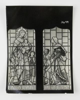 Brief description: Black and white photograph of a 2 light window depicting Christ blessing the children. Designed at the Goddard and Gibbs Studio, London