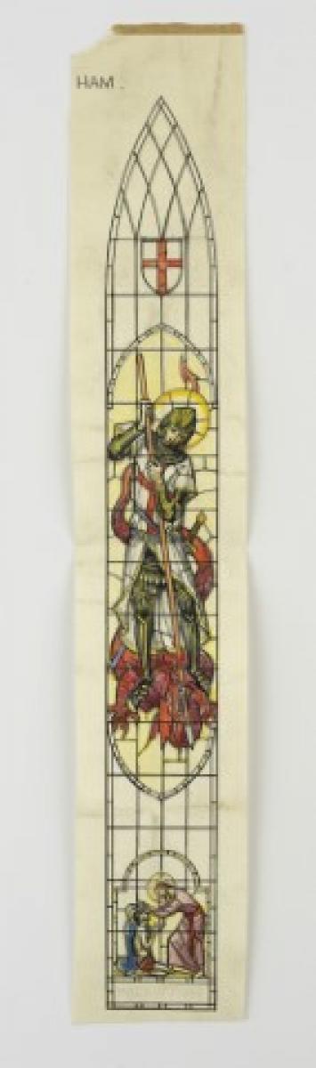 Brief description: Design for a stained glass window made up of one light depicting St George slaying the dragon. Designed at the Goddard and Gibbs studio, London