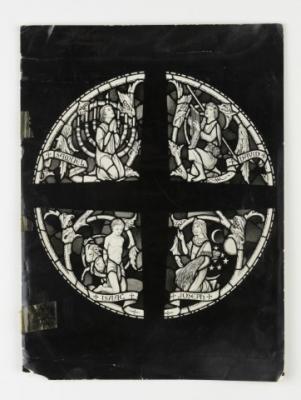 Brief description: Black and white photograph of a roundel window depicting Samuel, David, Joseph and Issac. Designed at the Goddard and Gibbs Studio, London