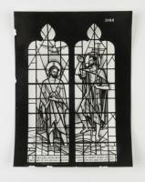 Brief description: Black and white photograph of a 3 light window depicting martyrs. Designed at the Goddard and Gibbs Studio, London