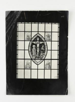 Brief description: Black and white photograph of a single light window with central lozenge depicting the crucifixion. Designed at the Goddard and Gibbs Studio, London