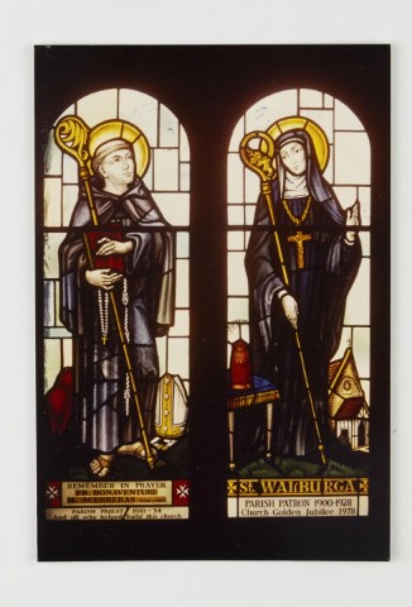 Brief description: Colour photograph of a 2 light window with depicting a Bishop and St Walburga. Designed at the Goddard and Gibbs Studio, London