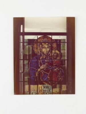 Brief description: Colour photograph of a single panel depicting Our Lady of Czectochwa with lead removed on the workbench. Designed at the Goddard and Gibbs Studio, London