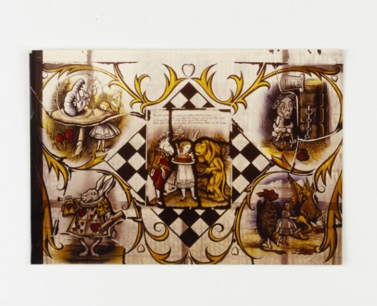 Brief description: Colour photograph of a single panel on a workbench depicting scenes from Alice in Wonderland. Designed at the Goddard and Gibbs Studio, London