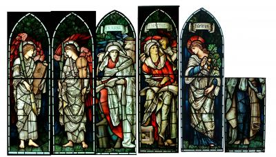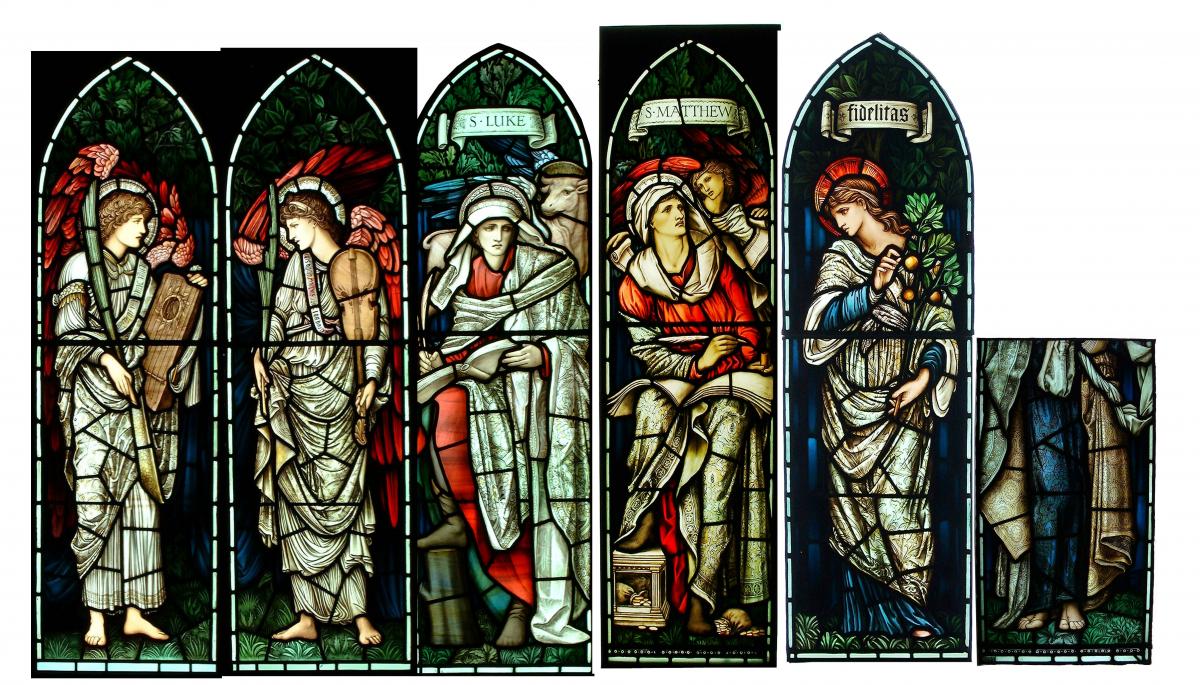 Brief description: Two three light windows depicting Angel Musicians, St Luke, St Matthew and Fidelitas designed by Edward Burne-Jones and made by Morris and Company 1910-1912. The windows are in an Italianate style.