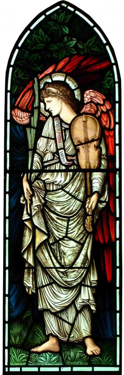 Brief description: Two-panel light of Angel Musicians designed by Edward Burne-Jones and made by Morris and Company in 1910=1912. Italianate style. Angel facing right, palm in left hand, violin in right. Fillet around hair, inscription around neck. Red wings, cream robe.
