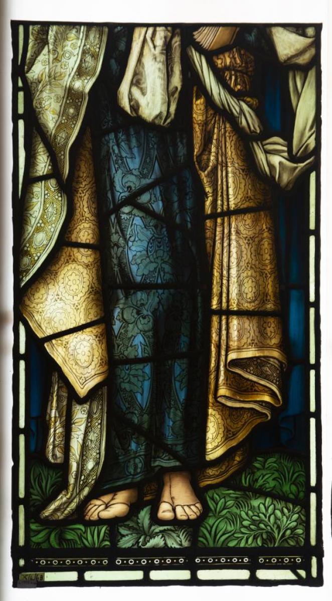 Brief description: Lower panel of two-panel light, possibly of St Mark designed by Edward Burne-Jones and made by Morris and Company 1910=1912. Lower panel only, upper panel missing. Standing figure, pages of book on top, feet on leafy ground