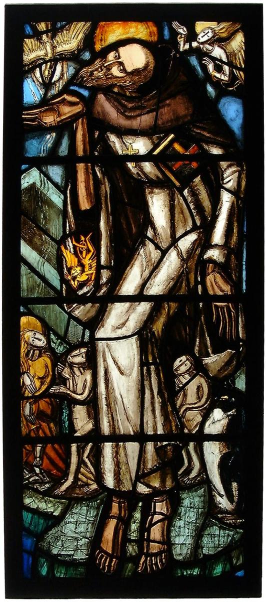 The temptation of St Francis is brought to life in this dynamic window by Moira Forsyth (1905-1991). Saint Francis stands in an awkward posture, head bent severely to one side. He is wearing his cream monk habit with grey hood and has a bible tucked under his left arm. He is surrounded by impish creatures, who can be seen little winged devils are at his head, knee and feet. There is an empty tomb behind him, and his is tall figure is rather emaciated. St Francis of Assisi was born c.1181 and is the patron saint of animals. Forsyth, is often described as one of England's most notable stained glass artists. She received many prestigious commissions for Cathedrals, schools and parish churches across the UK. She spent much of her working life at The Glass House studio in Fulham in Greater London alongside artists such as Wilhelmina Geddes, Mary Lowndes and Alfred J. Drury. This panel was made at the Royal College of Art when Forsyth was still a student and demonstrates her playfulness.