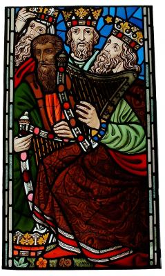 Brief description: Stained glass panel depicting 3 crowned musicians. Designed by William Butterfield and made by William Henry O'Connor in about 1856.