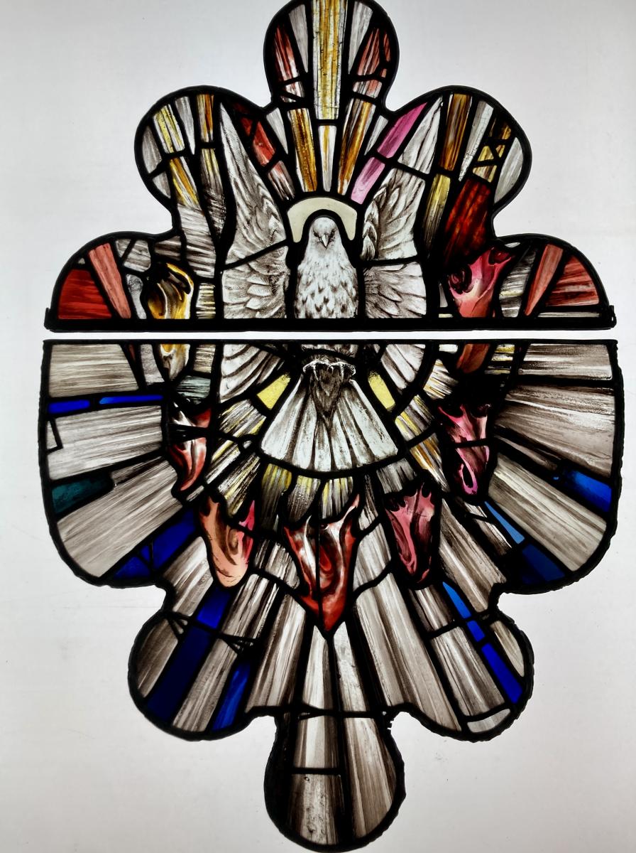This dove, descending from the heavens, is part of the tracery of a large seven-light east window depicting Christ Enthroned with Angels and Saints. It was made by leading Arts and Crafts artist Christopher Whall (1849-1924) in 1906 for St. Mark’s Church, Claughton, Birkenhead, Cheshire. St Mark's Church, connected to the local St. John the Evangelist Church in Birkenhead was built in 1891, and became a separate parish in 1922. By 1991 it had closed, and the valued “Father Willis” organ transported to a new home in Leiden Cathedral in the Netherlands. The superb east window, formed of seven-lights and more than 50 individual panels, was also saved from demolition in its entirety (apart from one missing panel from the bottom row), and put in storage before being transported to its current home, the Stained Glass Repository; a charitable trust that seeks to rescue good quality glass, and find an alternative home for it.